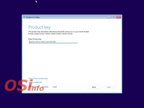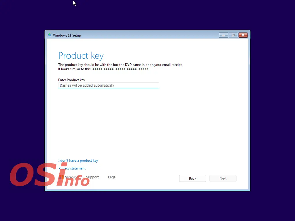The next window allows you to enter the product key. If you have the key handy, enter it. You can also select “I don't have a product key.” This option allows you to enter the key after the system has been installed. Click “Next.”