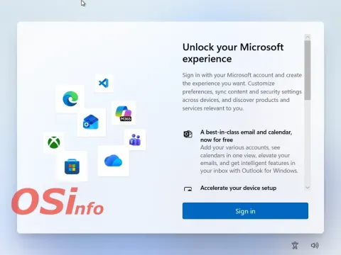 After restarting, we will see the windows of another configuration wizard. Currently, installation using official methods requires logging in with a Microsoft account. Select the “Sign in” button on the screen.