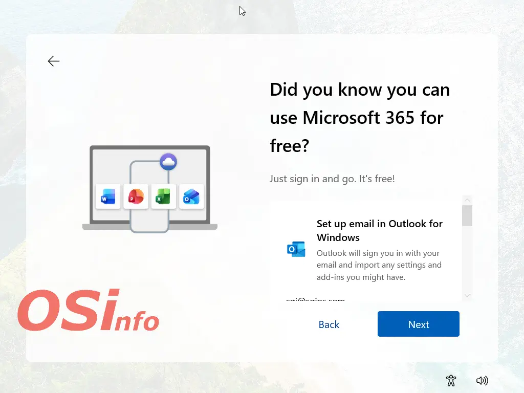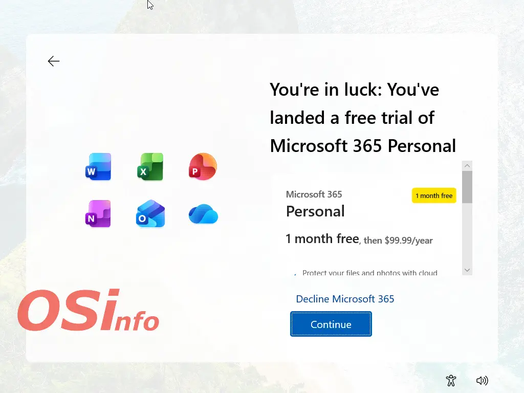 Another window. Here, we can take advantage of a free month of Microsoft 365. If we do not want to use it, we click on the small text “Decline Microsoft...”.