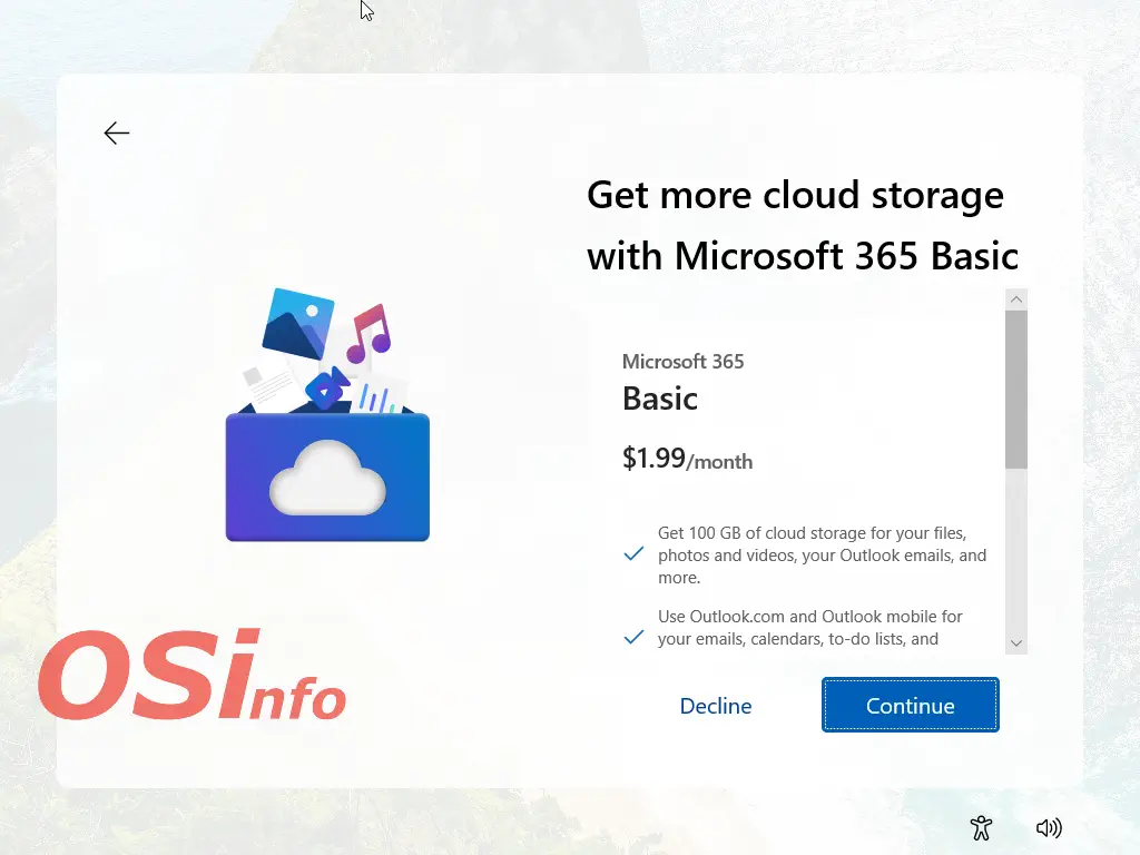 More settings. Additional cloud storage space—for a fee. We can click “Decline.”