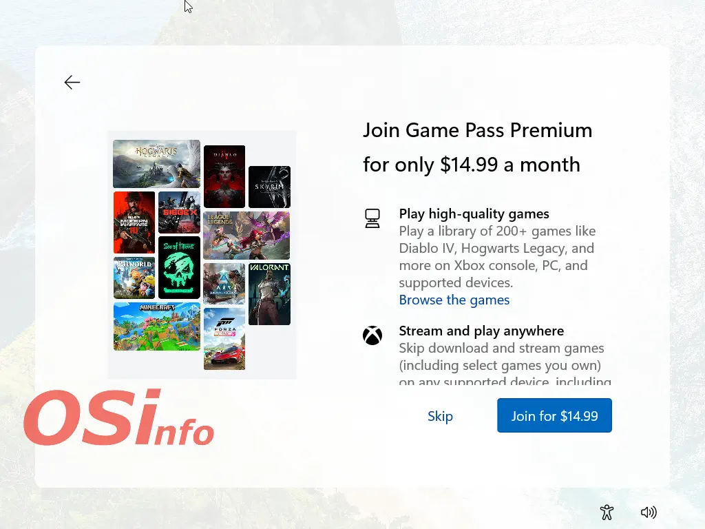 The next window concerns the Game Pass subscription. The subscription involves fees. If you do not want to use it, click “Skip.”